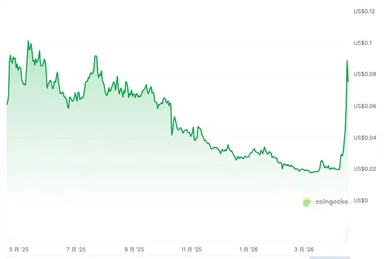 ENJ:4 月 8 日前后开始异动,ENJ 一根涨幅 34.77% 的阳线从 0.02 美元拉到 0.027 美元,打破了持续数月的下跌节奏。此后加速上涨,最近一根 K 线直接从 0.065 美元附近冲至 0.105 美元高点,当前回落至 0.077 美元。整个反弹阶段的斜率远比此前下跌陡峭,呈现出典型的超跌后垂直拉升形态。