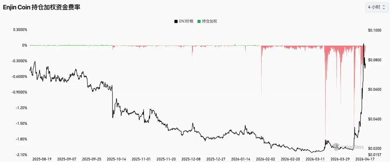 空头拥挤放大了波动,在 ENJ 的暴涨中,期货端的轧空是价格加速上涨的主要推手。空头仓位在超跌环境中大量堆积,一旦价格突破关键阻力位,空头被迫买入回补形成级联效应,推动价格远超任何基本面能解释的水平。ENJ 的期货在几天内极度为负,就是这个过程的直接体现。