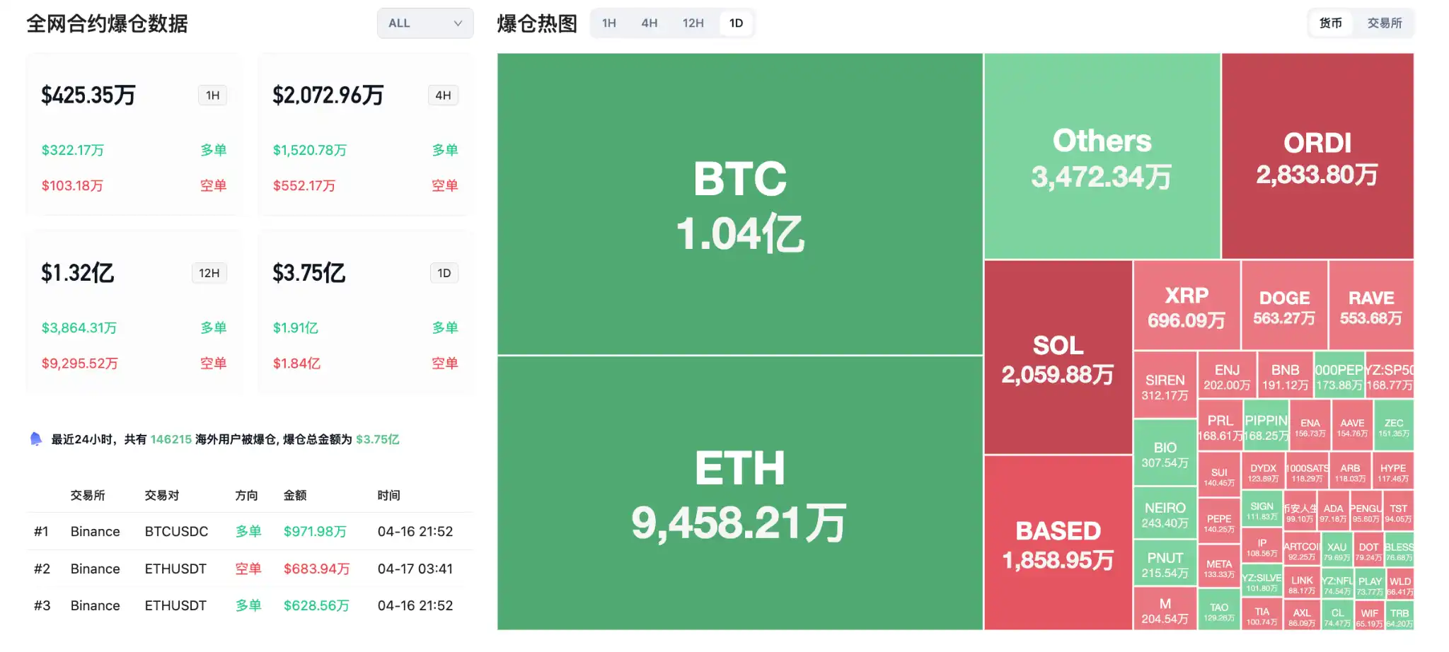 24小时爆仓数据:全球共146215人被爆仓,爆仓总金额为3.75亿美元,其中BTC爆仓1.04亿美元、ETH爆仓9458万美元、SOL爆仓2059万美元。