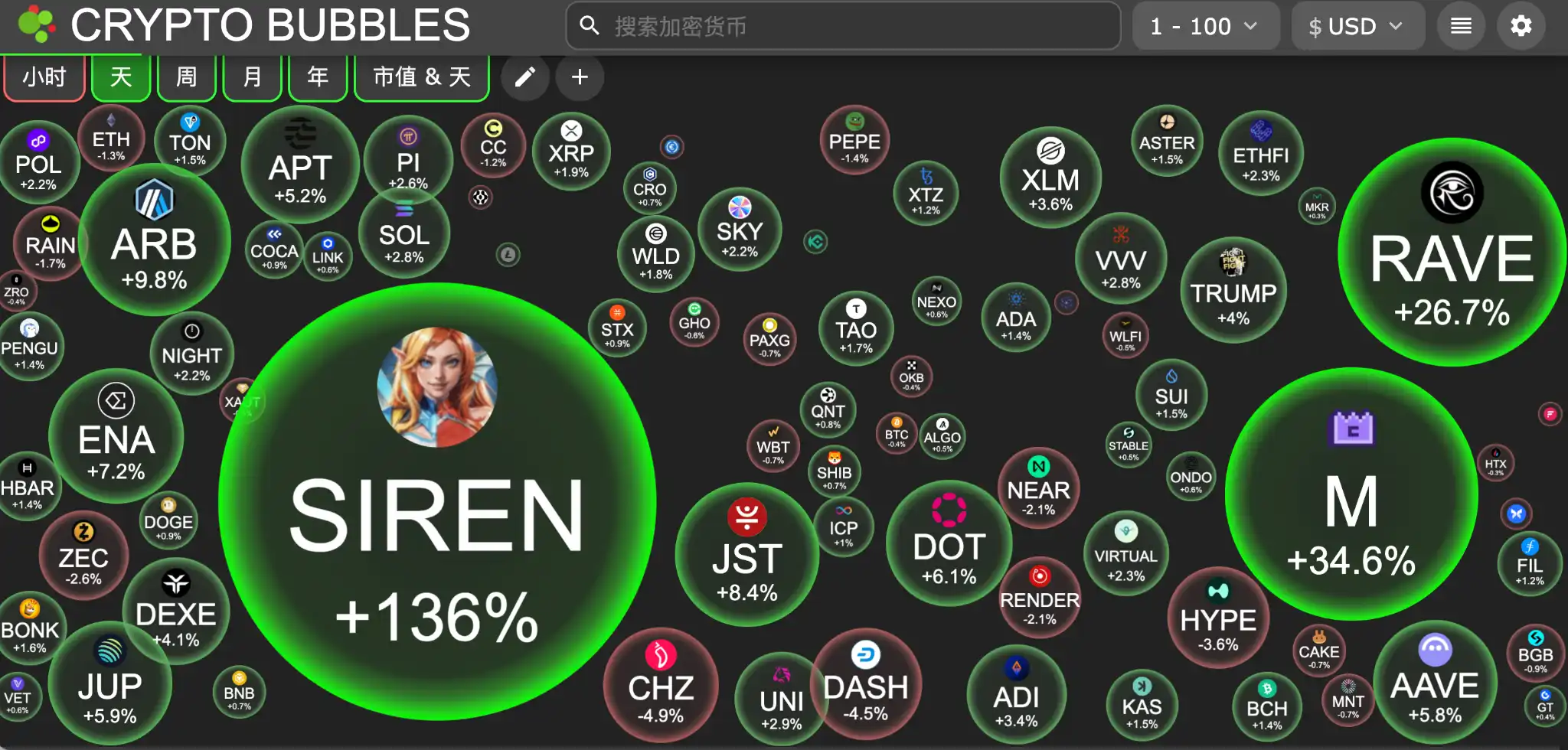 今日市值前100币种最大涨幅:Siren 涨 136%、MemeCore 涨 34.6%、RaveDAO 涨 26.7%、Arbitrum 涨 9.8%、JUST 涨 8.4%。