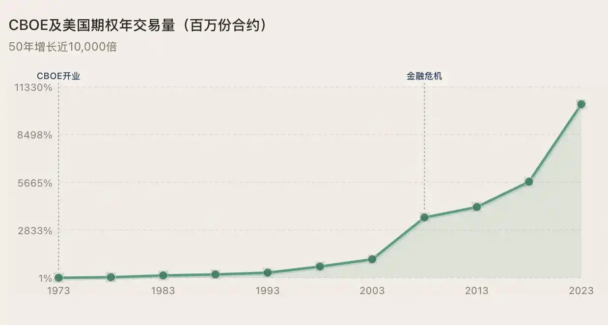 1973 年 4 月 26 日,芝加哥期权交易所(CBOE)开业。第一天只能交易 16 只股票的看涨期权(Call)。看跌期权(Put)1977 年加入。同年,Fischer Black 和 Myron Scholes 发表了改变金融史的 Black-Scholes 期权定价模型,为期权交易提供了数学基础。