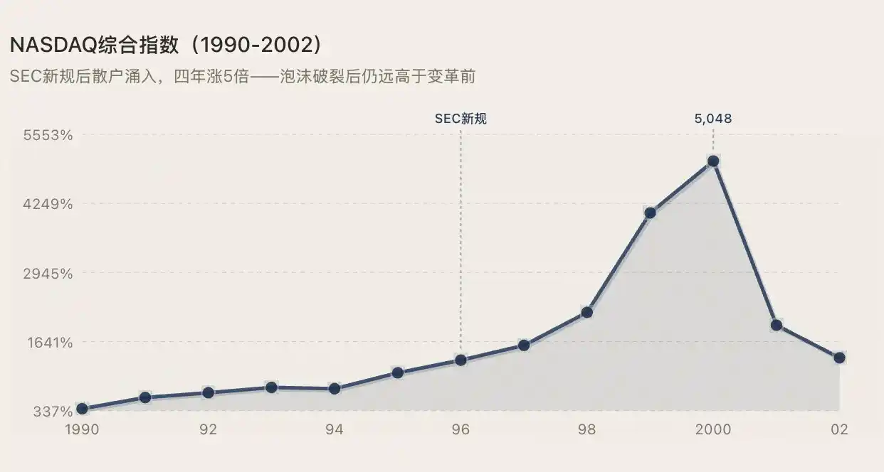NASDAQ 从 1971 年成立起就是电子交易平台——人类历史上第一个。真正在 1996-1997 年发生的变革是两件事:SEC 的 Order Handling Rules 打破了做市商对报价的垄断;在线券商(E*Trade、Ameritrade)把交易佣金从 50-100 美元压到了 10 美元以下。