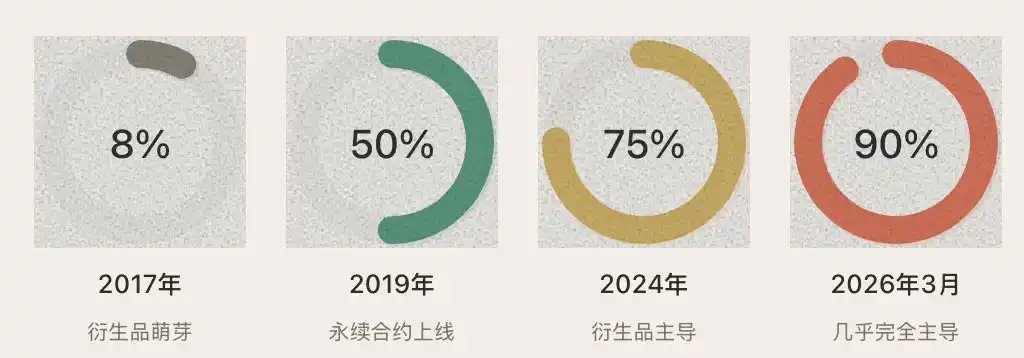 衍生品占总交易量比例从 2017 年的不到 10% 上升到 2026 年 3 月的约 90%——衍生品已经彻底主导了加密市场的定价权: