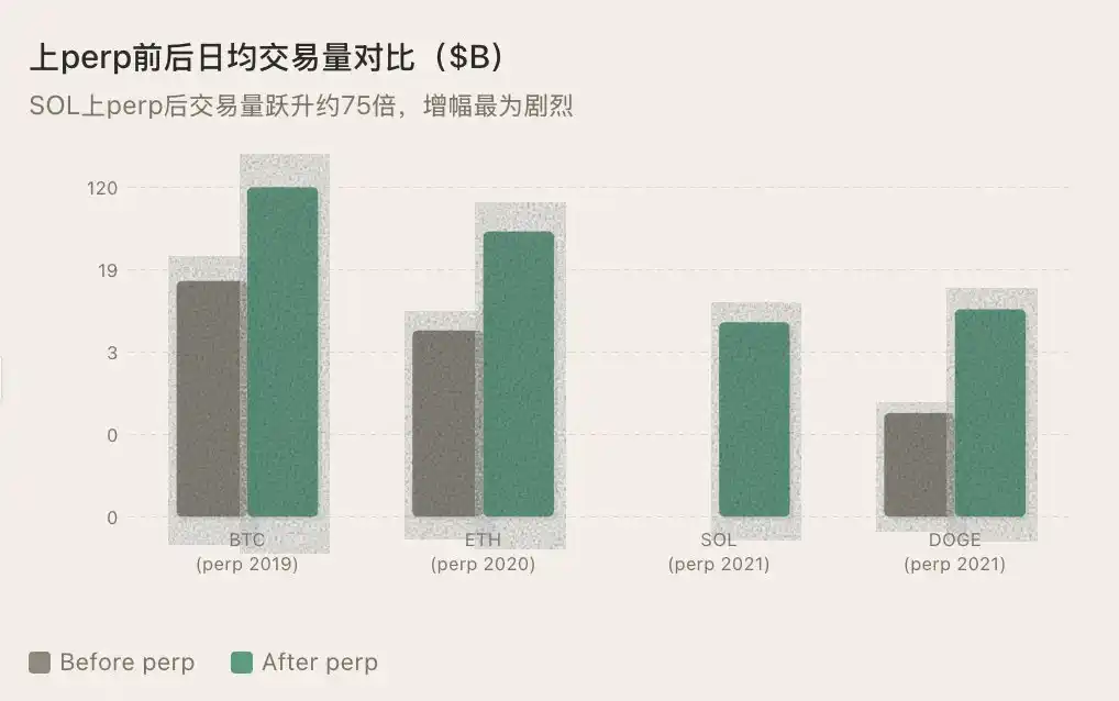 规律继续成立:BTC 有了 perp 迎来大牛市,ETH 也是,SOL 也是,每个上了 perp 的山寨币都经历了流动性跃迁。