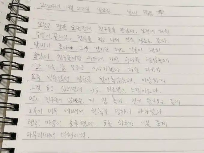 让GPT帮我翻译了下,确实不是乱码,大概是一份韩国高中生日记,内容是周日早上和朋友们上完补习班后,下午去喝了咖啡,觉得有朋友真好,巴拉巴拉……