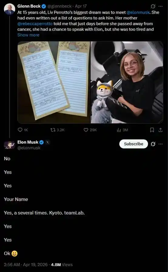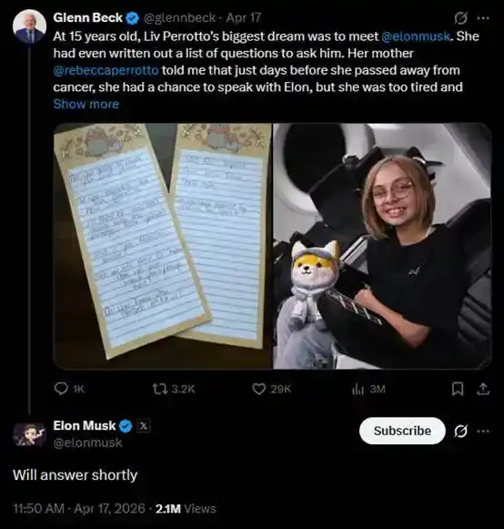 4 月 17 日,马斯克在 @glennbeck 提及此事的推文下回复,「稍后回答。」