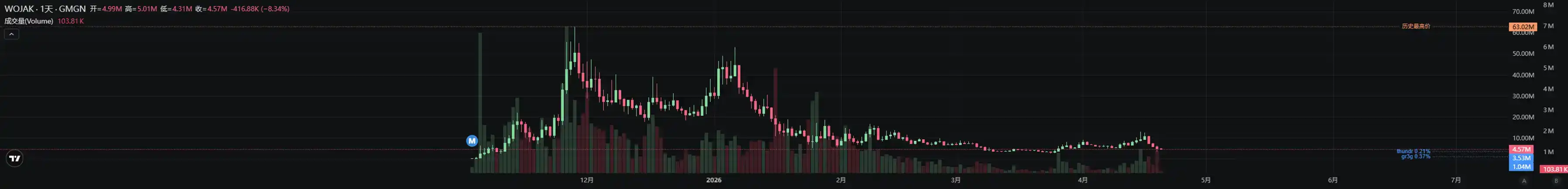 Wojak 是一个经典的 meme 形象,meme 玩家们都不陌生。SOL 上的 $WOJAK 在 3 月底开始缓慢复苏,从 300 万美元市值逐渐回暖到最高 1200 万美元市值。