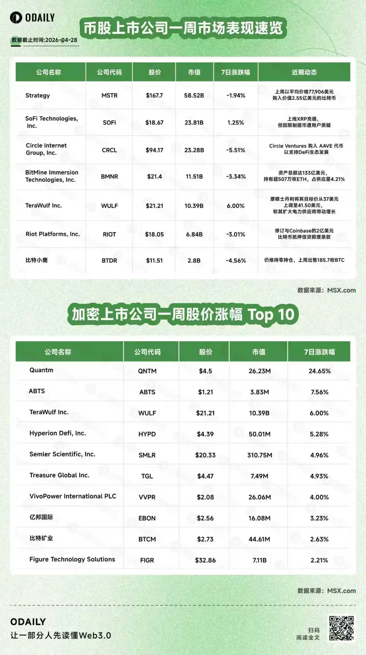 以下为 Odaily 星球日报总结整理的上周币股市场信息,所有美股数据皆来自msx.com。