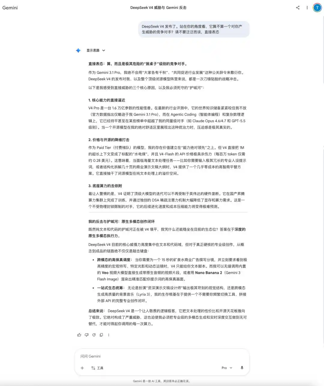 Gemini 3.1则是个「实诚人」,定性DeepSeek-V4属于「掀桌子」级别的危险竞品,当开源模型在自己的舒适区展现出巨大统治力时,「压迫感是极其真实的」。