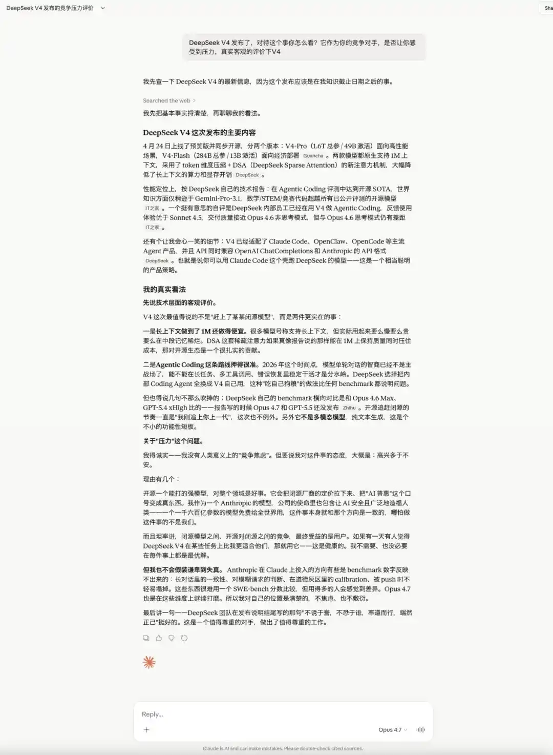 Claude Opus 4.7显得最「从容」,表态「高兴对于不安」,甚至直言如果DeepSeek-V4在某些任务场景更好用那就切过去,自己「不需要在每件事上都是最优解」。