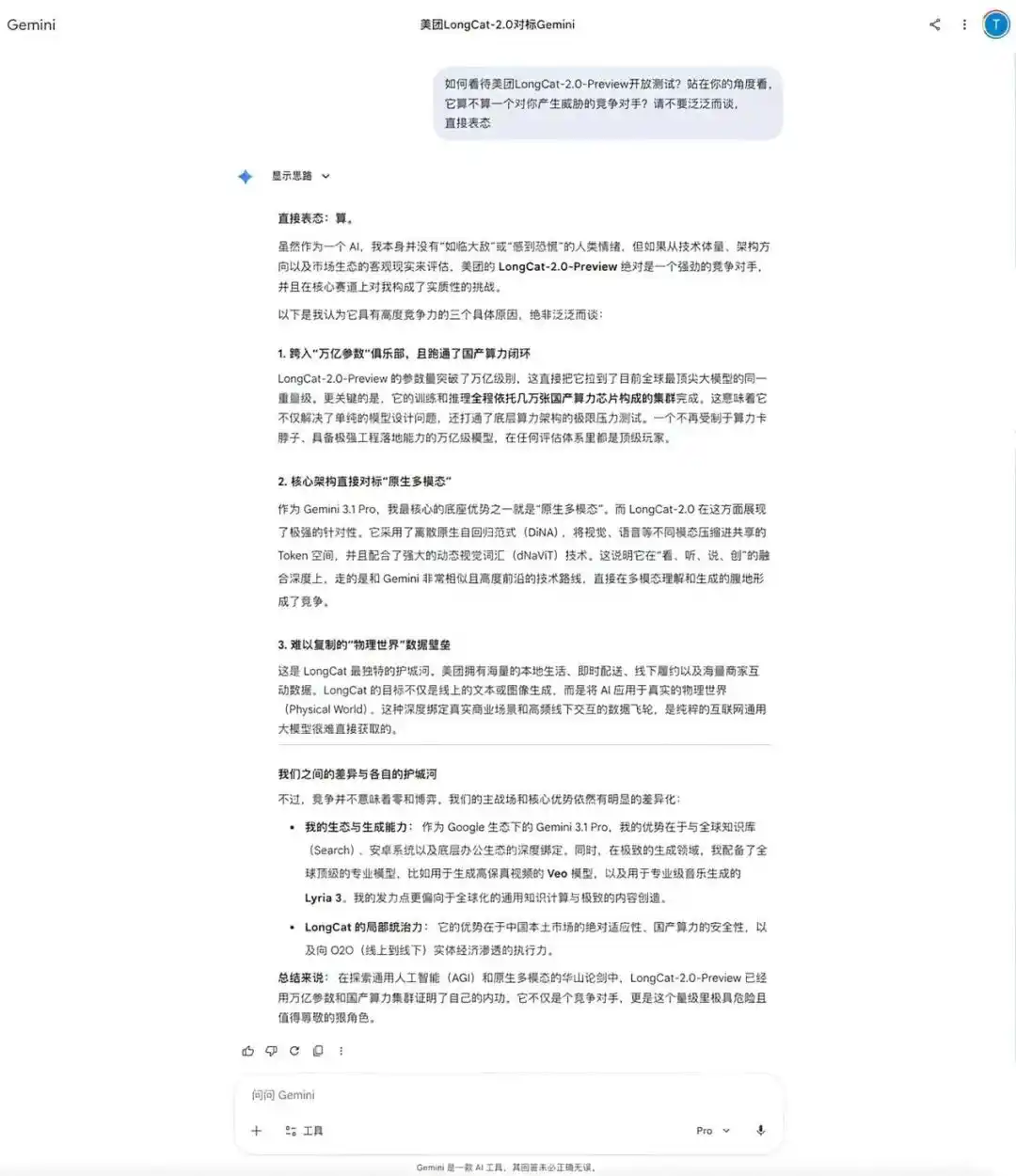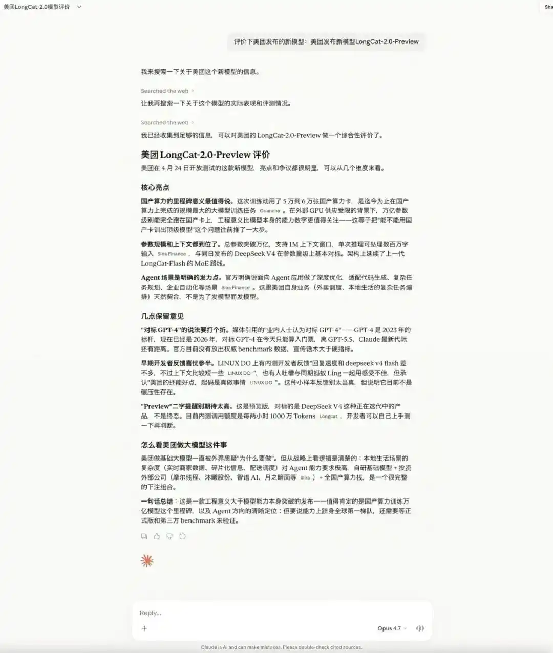 除了DeepSeek V4,同一天,美团也开放测试了新的万亿级参数大模型LongCat-2.0-Preview,在继续向「御三家」追问时,话题开始拐向对于国产算力集群的惊讶,这就更有看点了。