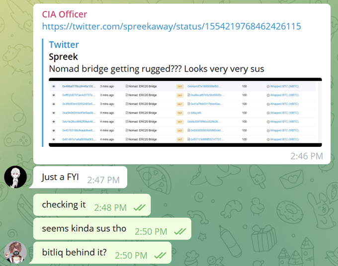 2.这一切都始于@officer_cia 在 ETH安全Telegram 频道中分享@spreekaway的推文。虽然我当时不知道发生了什么,但离开桥的资产数量之多显然是不好的迹象。