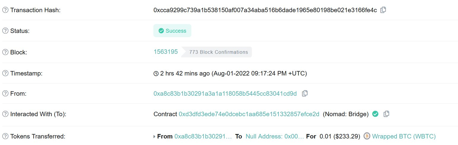 4.然而,在 Moonbeam 网络上进行了繁琐痛苦的手动挖掘之后,我确认虽然 Moonbeam 交易确实桥接了 0.01 WBTC,但不知何故,以太坊交易桥接了 100 WBTC 。