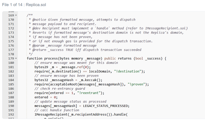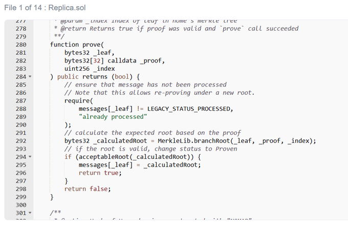 7.这只剩下一种可能性——副本合约存在致命缺陷。但是怎么做?快速浏览表明提交的消息必须属于可接受的根。否则,第 185 行的校验将失败。
