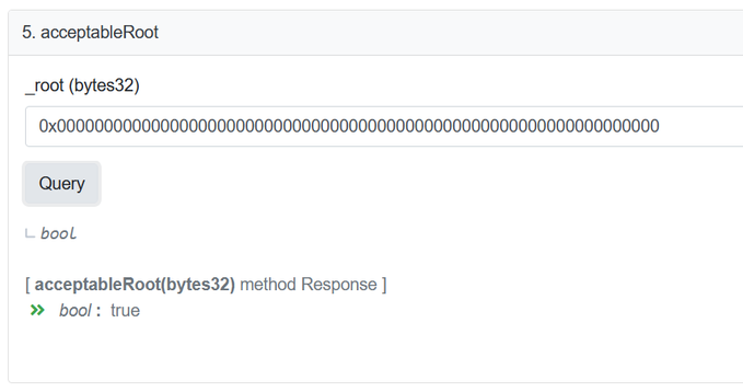 8.幸运的是,有一种简单的方法可以检查这个假设。我知道没有被证明的消息的根是 0x00,因为消息[_messageHash] 将是未初始化的。我所要做的就是检查合同是否会接受它作为根。